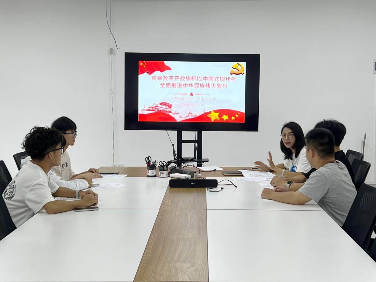 本网讯(大数据学院 文/图 第一学生党支部)8月29日,大数据学院第一学生党支部在睿知楼510会议室开展“高举改革开放旗帜 以中国式现代化全面推进中华民族伟大复兴”主题党日。支部书记石春梅主持,支部全体党员参加。