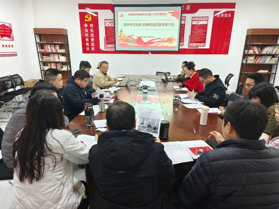 本网讯(大数据学院 文/图 王喜宾)2024年12月25日下午,大数据学院教师党支部在党员活动室开展“坚持守正创新 挺膺担当贡献青春力量”主题党日。支部书记杨楠主持,支部党员参加会议。
