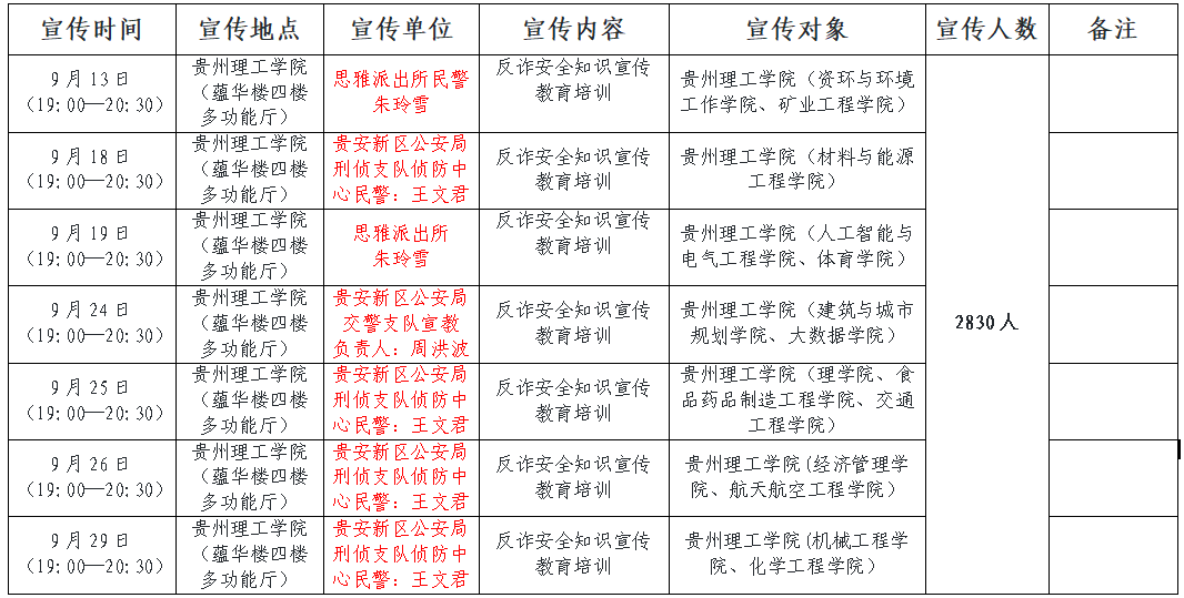为进一步加强电信网络诈骗宣传力度,切实提高2024级新生识诈、防骗能力,继9月初开展新生反诈安全宣传教育进军训培训后,9月中旬至9月底,我校在上级部门的支持下。再次对新生分学院、分批次、全覆盖开展反诈安全宣传教育工作。