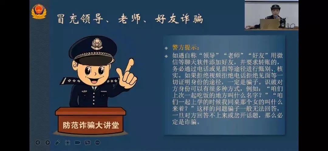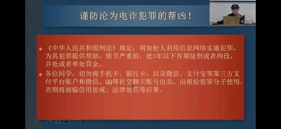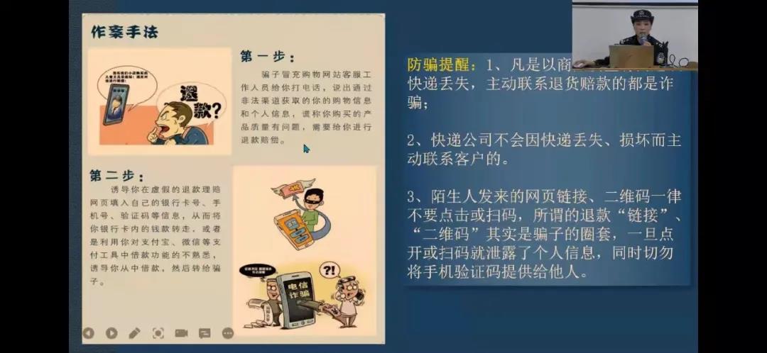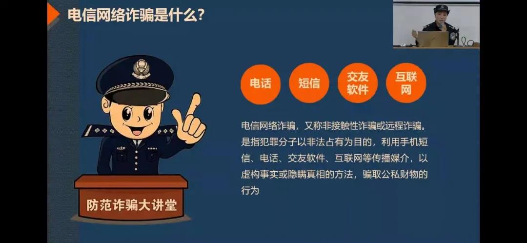 为进一步遏制大学生网络电信诈骗多发高发态势,2021年11月4日晚上,保卫处邀请贵安公安刑侦支队王恩荣副支队长,在贵安校区知行楼3301教室开展题为“如何防范电信(网络)诈骗”的直播讲座活动,全校学生通过线上收看了直播讲座。