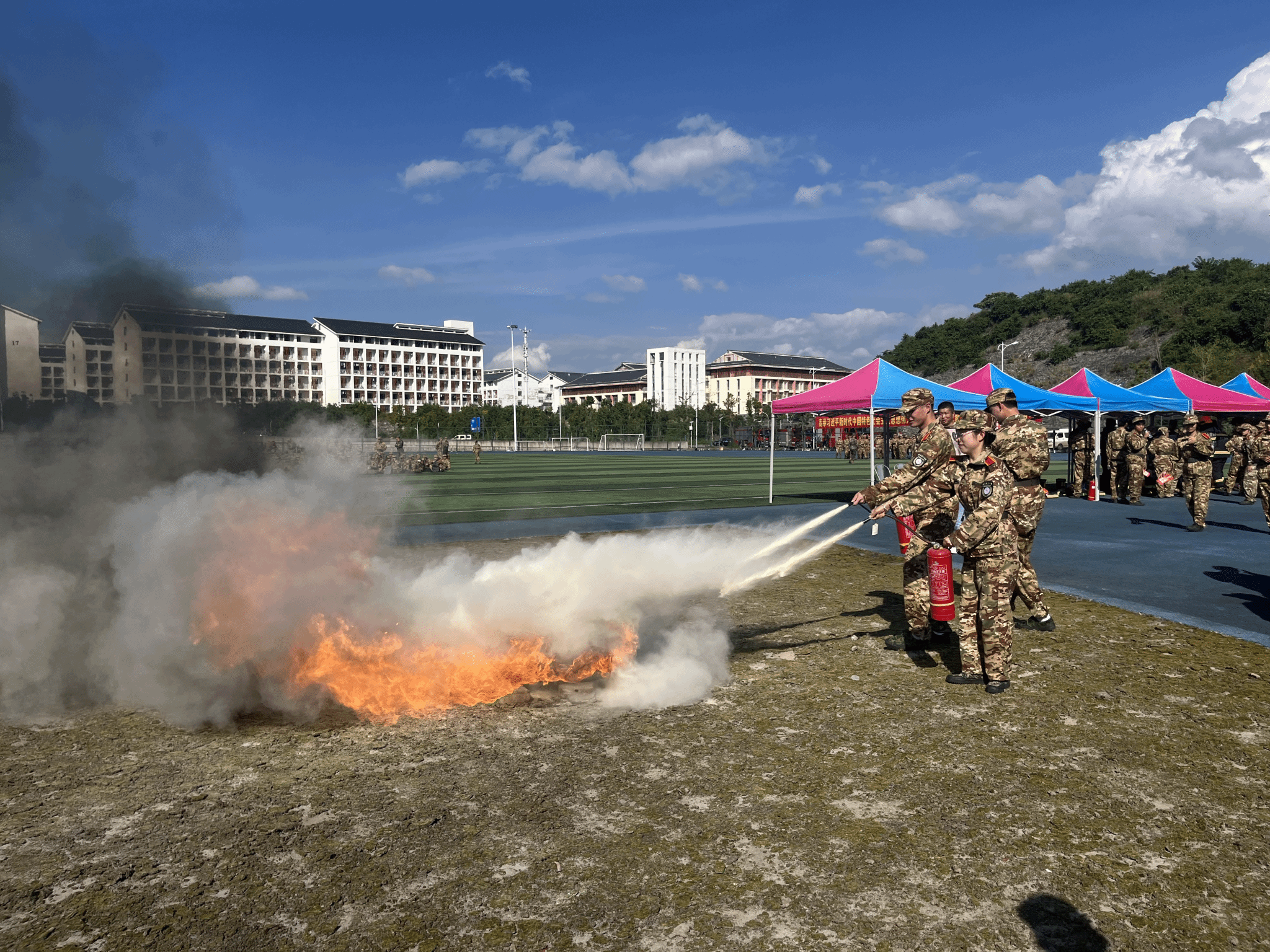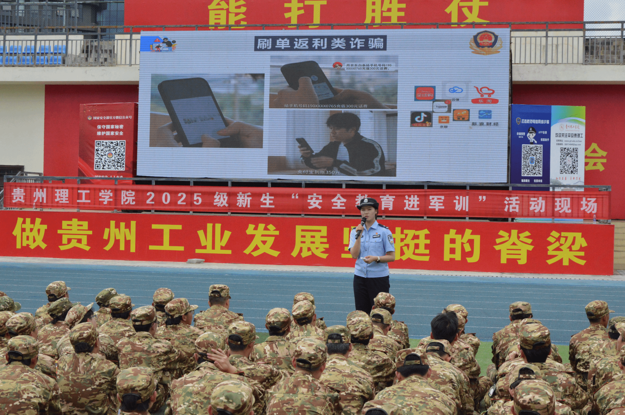 此次活动将安全教育融入军训,通过“理论+实操”模式,切实提升新生安全防范意识、反诈防骗能力以及应急处突能力,为平安校园建设夯实基础。
