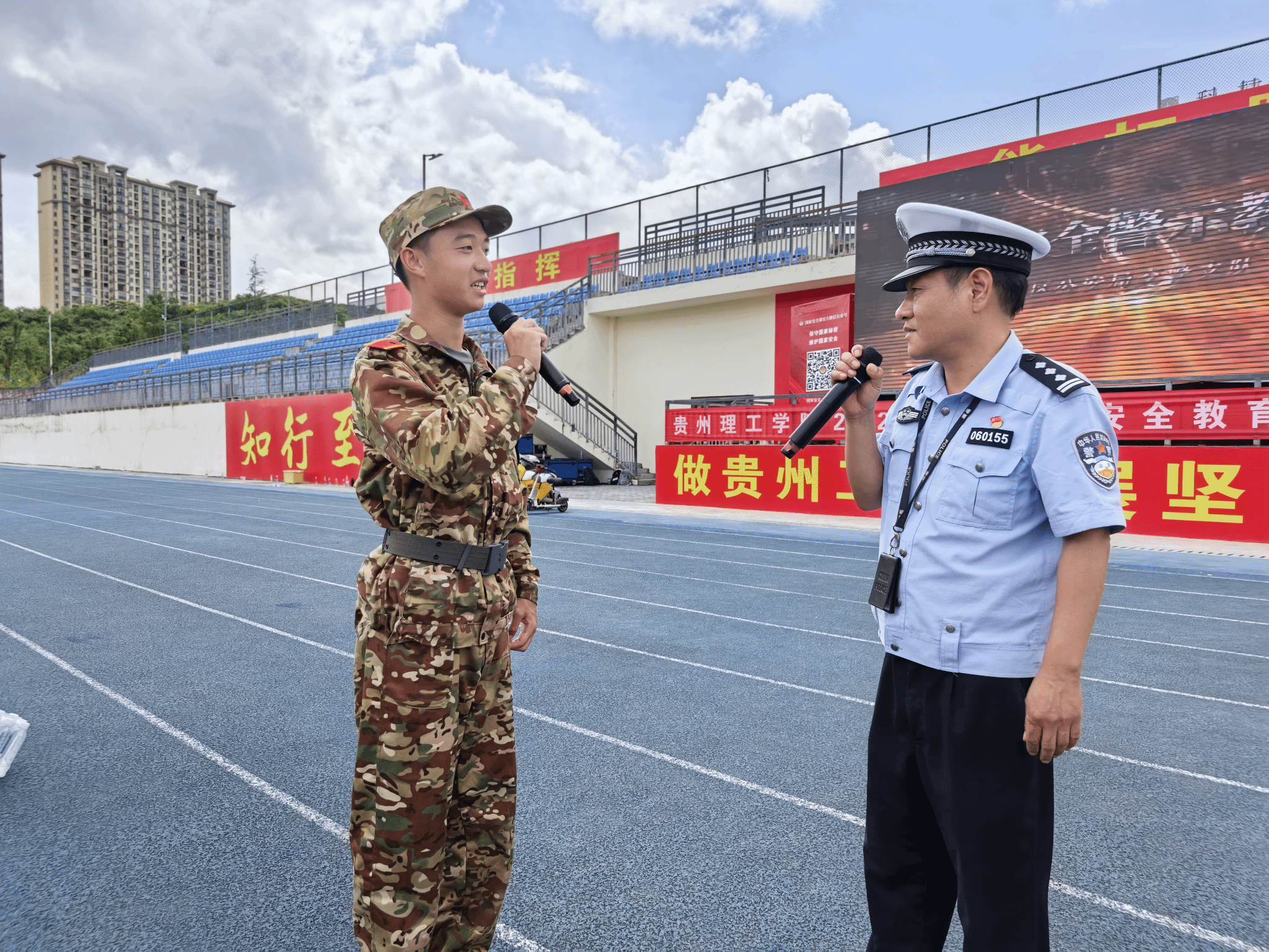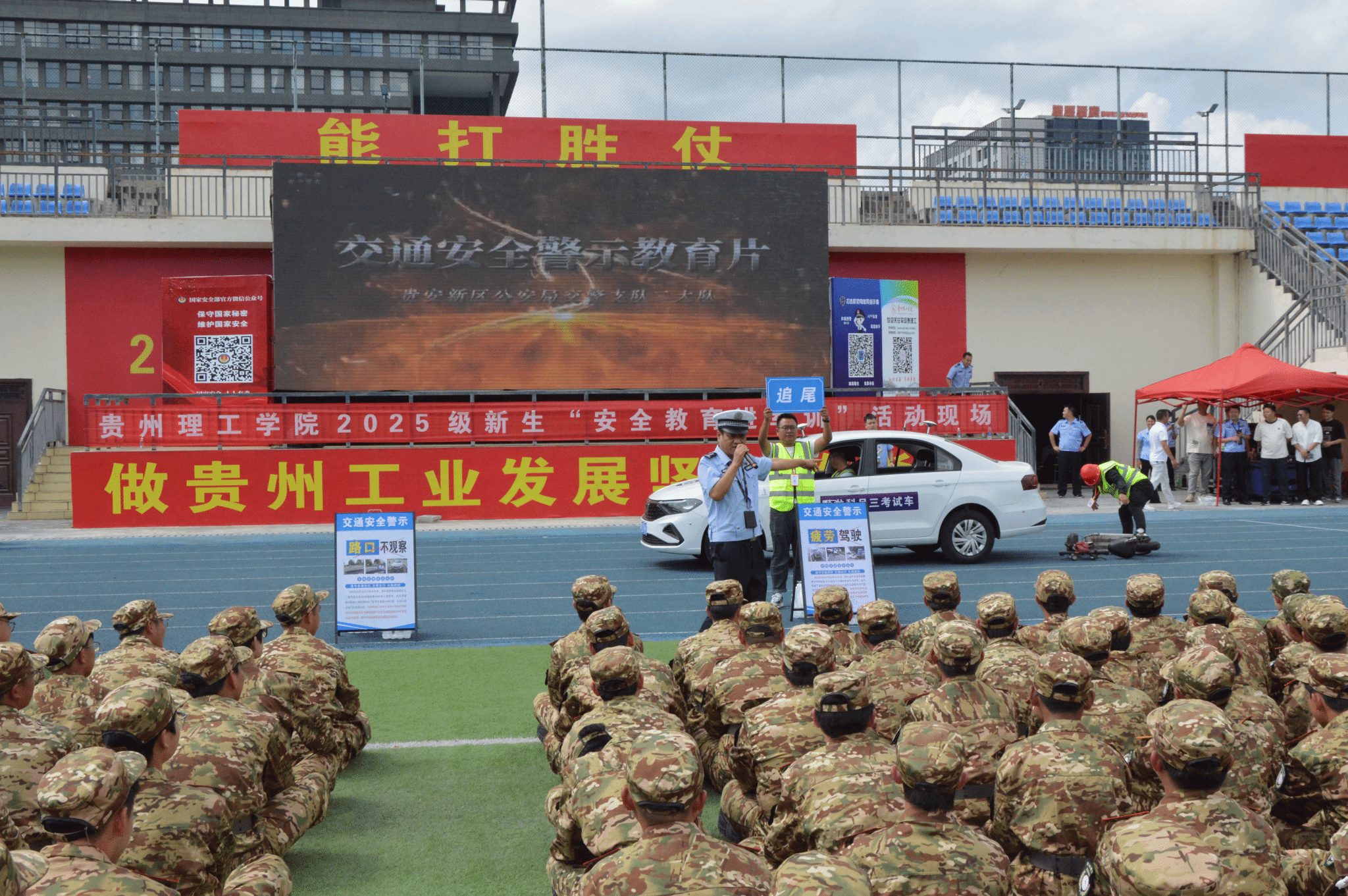 本次活动分为交通安全、反诈防骗以及消防安全三大板块。首先,贵安交警一大队大队长孔静开展交通安全宣讲,交通志愿者现场演示“开门杀”“追尾”等典型交通事故演练,强化学生出行安全意识。