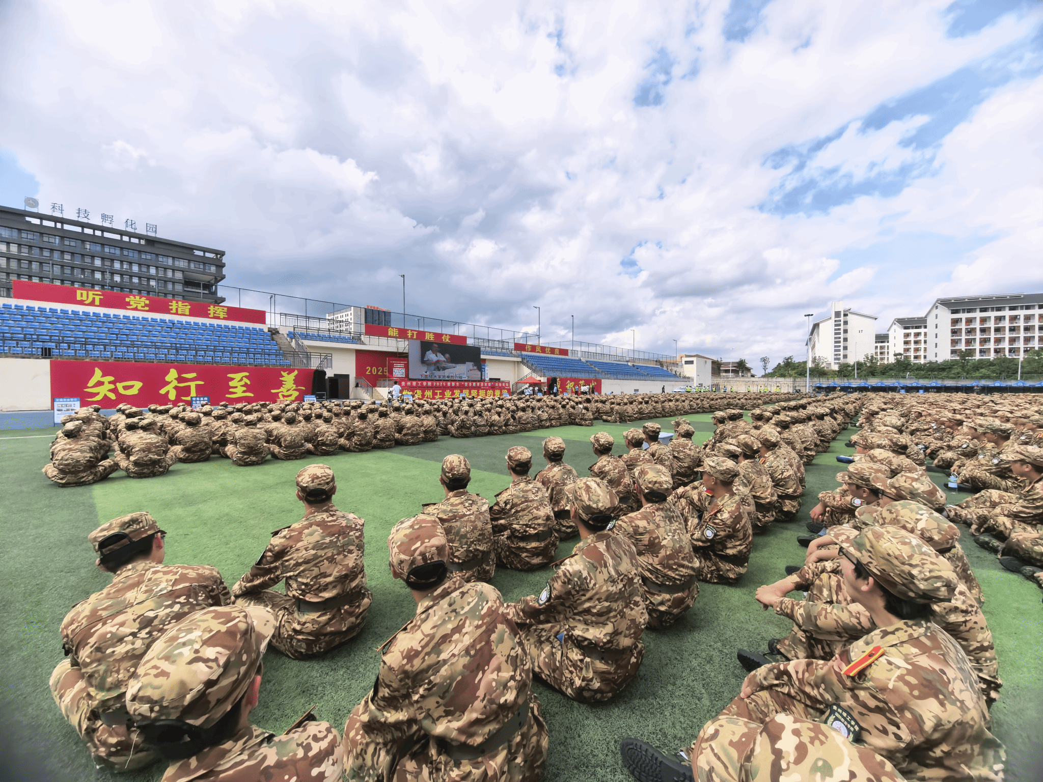 9月3日下午,我校“强化安全意识,筑牢校园防线”2025级新生“安全教育进军训”活动在南书院体育场拉开序幕,2800余名2025级新生参加。