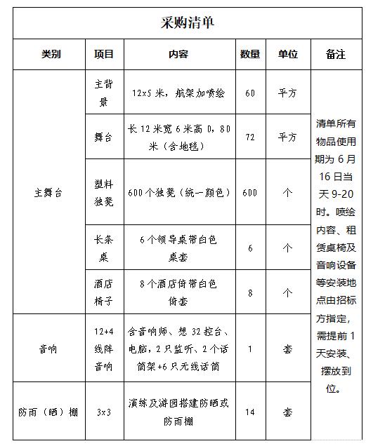 我校承办“贵安新区大学城第24个安全生产月启动仪式暨校园安全活动”,活动时间为6月16日全天(9-20时),活动地点在贵理工学院图书馆正大门前环形广场,根据使用需要,现进行该项目舞台搭建及设备租赁等采购,采购清单及要求详见附件。欢迎符合资格要求的供应商根据竞价邀请书的要求进行报价。