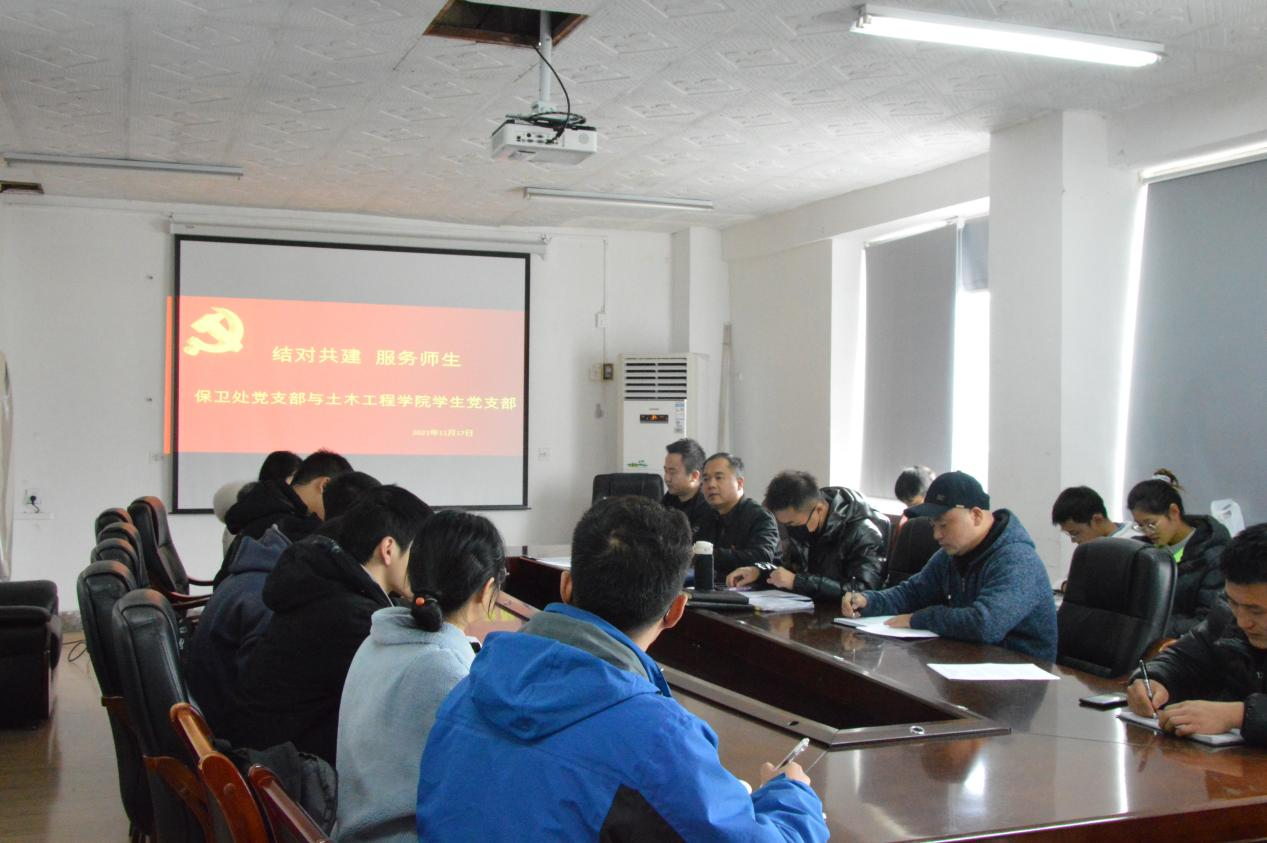 本网讯(保卫处,蔡运刚文/图),2021年11月17日,在行政楼十二楼土木工程学院会议室,保卫处党支部与土木工程学院学生党支部开展支部结对共建组织活动,两个支部30名党员同志齐聚一堂共同学习、座谈交流互动和开展安全知识培训活动,以共建促了解,促进工作联动,相互合作与进步,提升党员干部服务中心工作、服务师生、服务学校改革发展的能力。