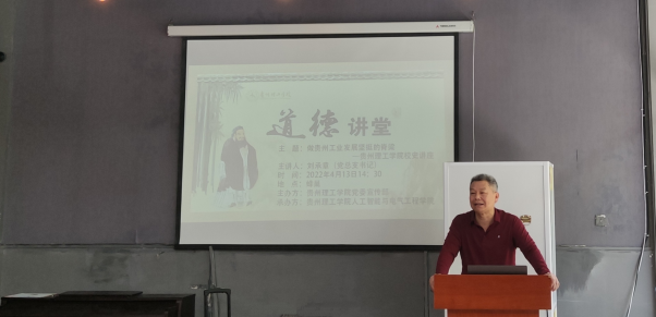 2022年4月13日下午14:30,人工智能与电气工程学院道德讲堂在蜂巢众创园开讲。党总支书记刘承章做主题为:做贵州工业发展坚挺的脊梁—贵州理工学院建校历程专题讲座。毕业班电自181、182两个班全体同学参加此次主题讲座。