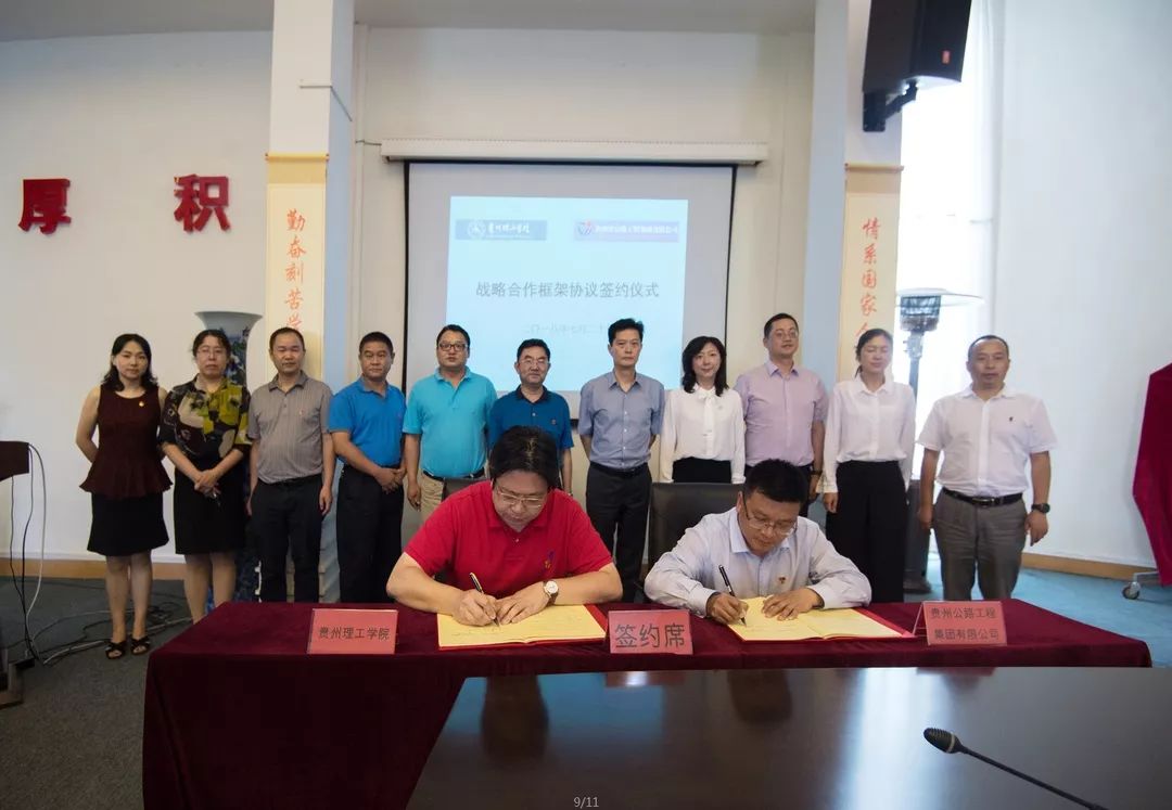 本网讯(交通工程学院 邹俊辉/文 秦志颖/图)2018年7月20日,我校与贵州省公路开发有限责任公司、贵州省公路工程集团有限公司战略合作协议签约仪式在贵州理工学院喀斯特会议厅举行。贵州省公路开发有限责任公司党委书记、董事长袁泉,董事、副总经理马白虎,董事、副总经理翦继军,贵州省公路工程集团有限公司党委书记、董事长廖柳,党委副书记高绚、副总经理田洪松,校党委书记曾羽,副校长宋建波、苏向东等出席了签约仪式。签约仪式由宋建波主持。