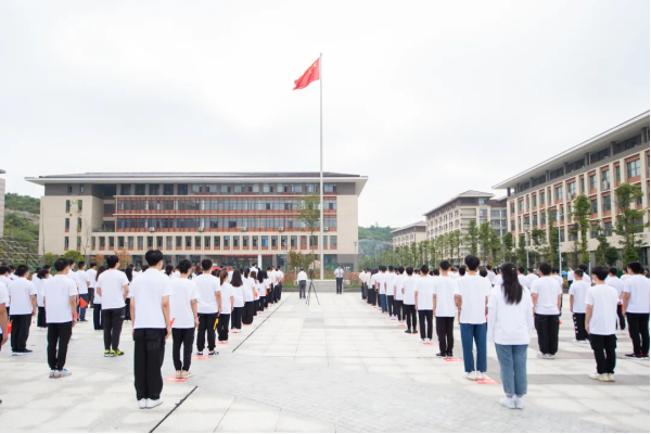 雄壮的国歌响起,鲜艳的五星红旗迎风展开,全体师生面向国旗,唱着国歌,向国旗致注目礼,目送国旗缓缓上升。