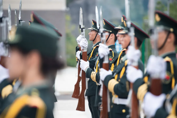 在《民族希望》诗朗诵中,英姿挺拔的国旗护卫队,迈着铿锵有力的步伐,护卫国旗行进到升旗台。