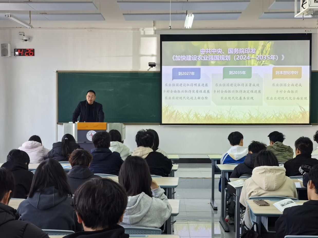 12月15日,副院长李少波以“阔步迈向农业强国”为题,为材料231、232班学子专题授课。他以2024年国家经济与“三农”发展亮眼数据为切入点,阐释了农业强国对民生保障、高质量发展和国家安全的重要意义。围绕“建设什么样的农业强国”,详细解读了农业强国“供给保障强、科技装备强、经营体系强、产业韧性强、竞争能力强”的共同特征,强调我国农业强国建设必须立足“大国小农”基本国情,坚持中国特色社会主义制度优势,走因地制宜、多元发展与“四化”同步协调推进的特色道路。他指出,材料科学在种业振兴、农机升级、农产品保鲜等农业强国建设关键领域作用突出。他寄语学子厚植爱农情怀,将个人理想融入国家战略;练就兴农本领,深耕农业领域材料应用难题;勇于创新实践,把课堂所学转化为服务农业现代化的实际能力。