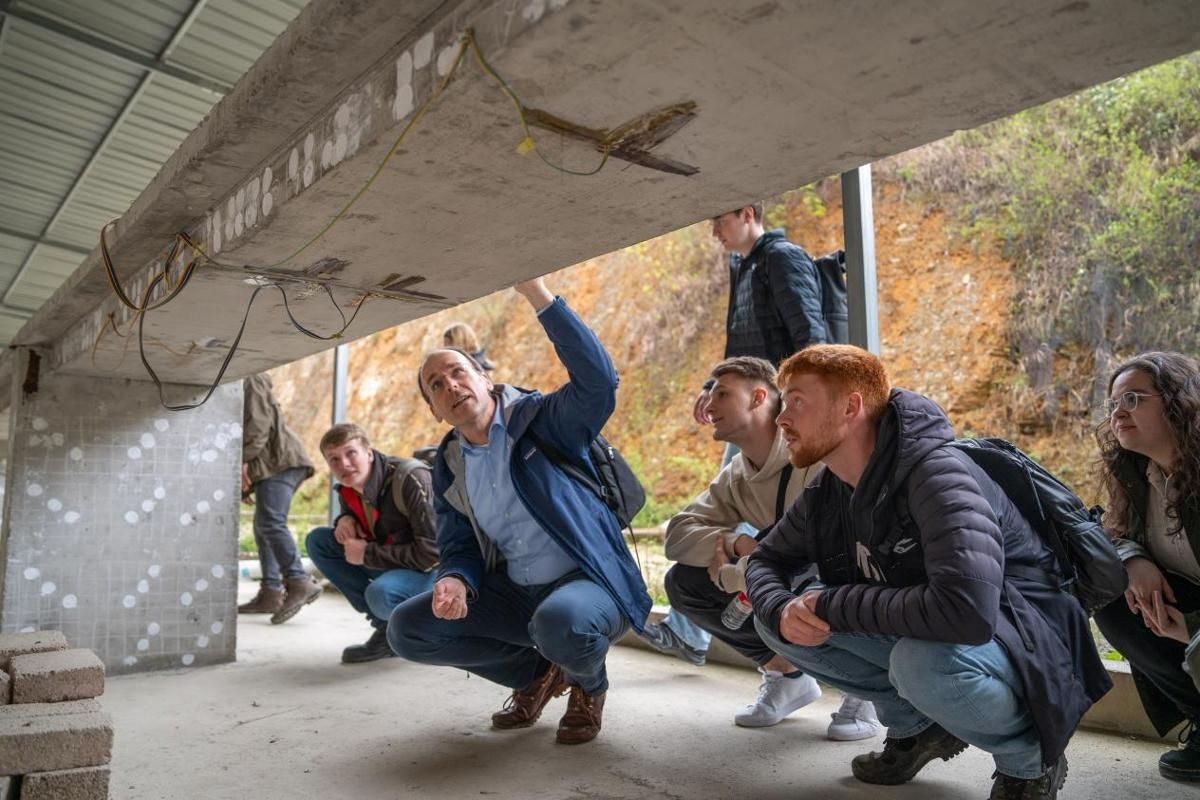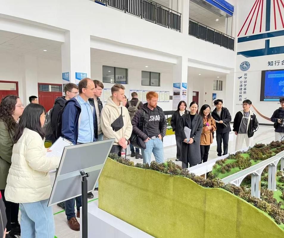 随后,代表团参观了土木交通水利学院的研学基地和实验室。德国交流生通过AR技术沉浸式体验桥梁建设的规划与施工过程。代表团还先后走访工程结构实验室、桥隧实验室、虚拟仿真平台及岩土工程实验室等,师生们对桥梁缩尺模型及土力学实验材料和器械表现出浓厚兴趣,并现场为随行学生开展了一堂生动的实践教学课,展现出深厚的专业共鸣。