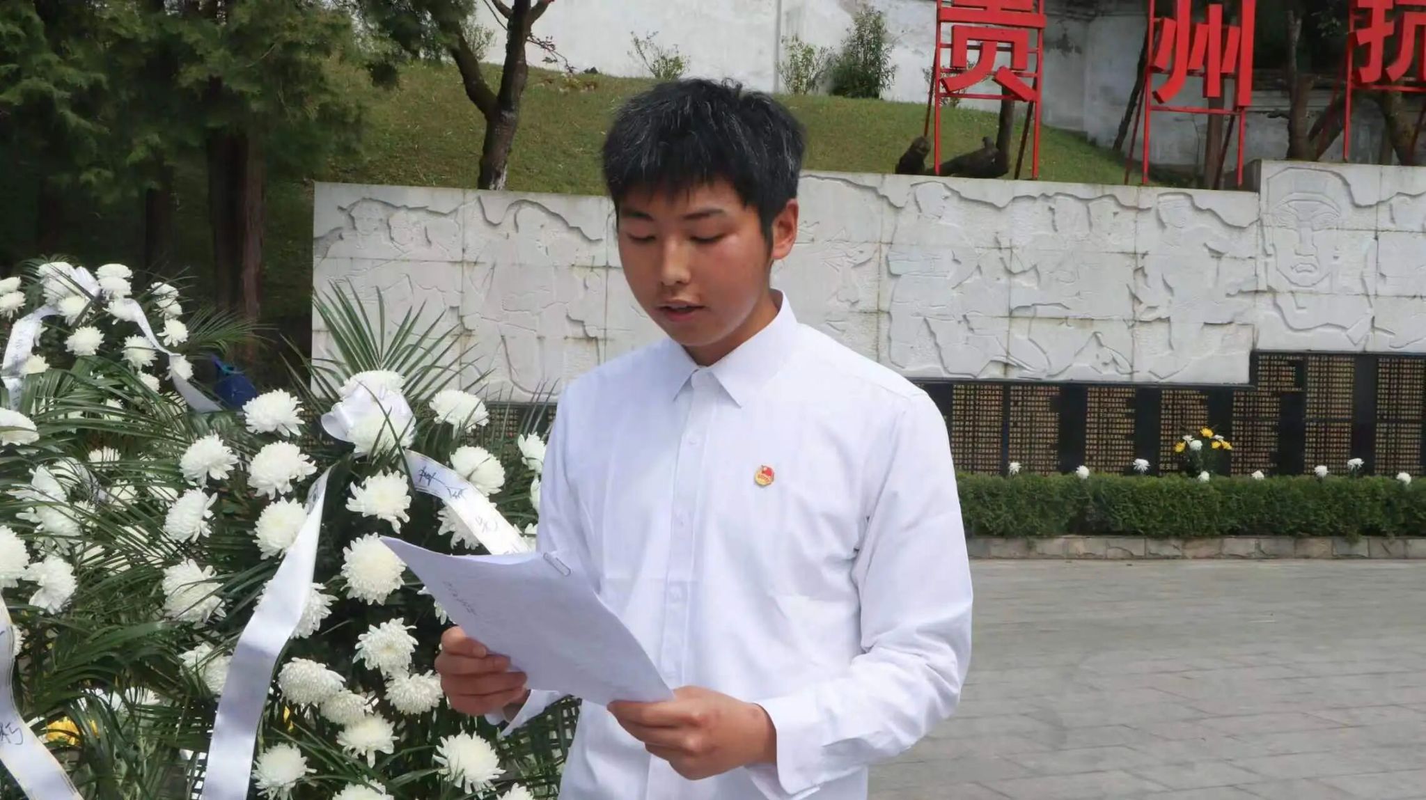 活动当天,全体人员手持菊花整齐列队,在高耸的烈士纪念碑前肃立默哀,深切缅怀革命先烈。默哀结束后,同学们依次敬献鲜花,向先烈们表达崇高敬意与无尽的哀思。随后,校团委学生兼职副书记邹肇伟带领同学们回顾革命历史,追忆先烈事迹,向同学们强调爱国主义情怀的重要性,倡议全体同学要铭记历史,砥砺前行,传承弘扬爱国主义精神。