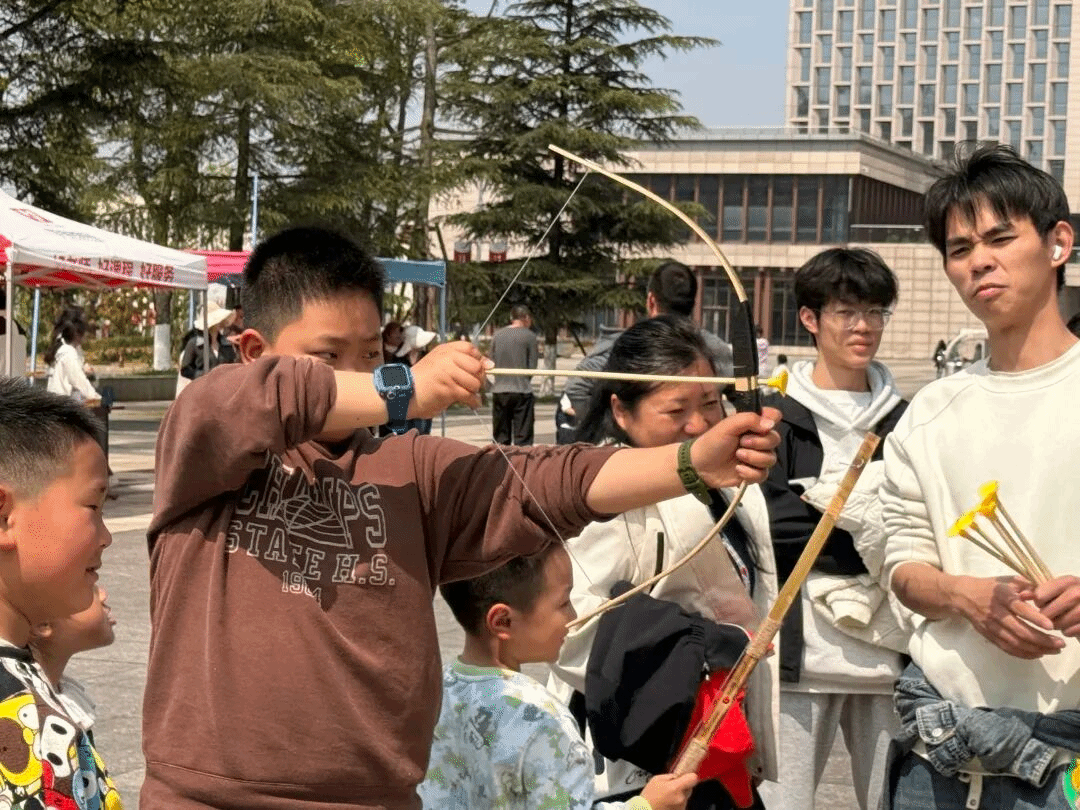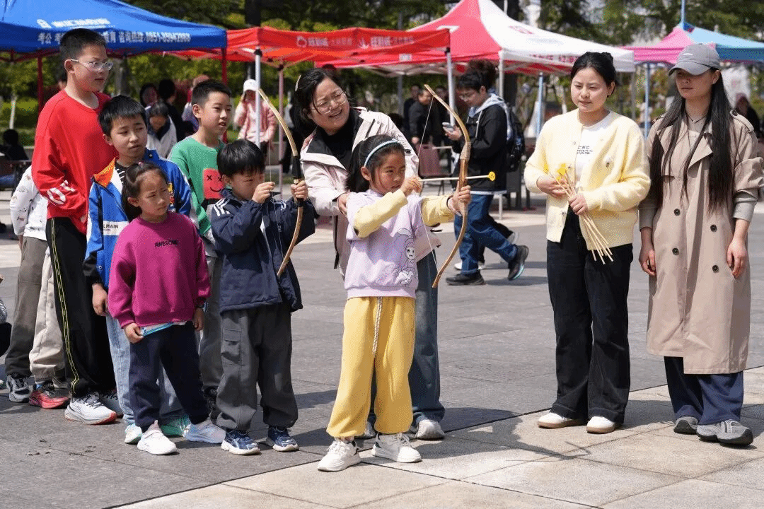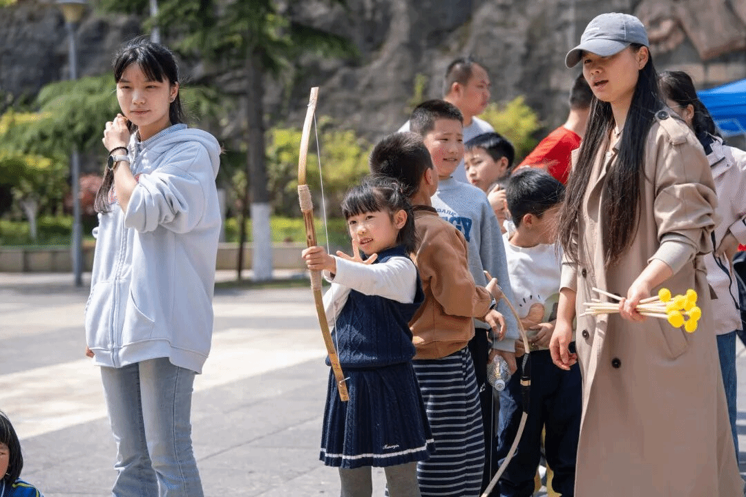 射箭体验:站姿端正、拉弓瞄准,小射手们一招一式有模有样,在挑战中收获专注与自信。
