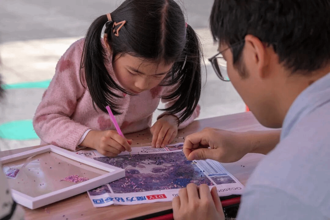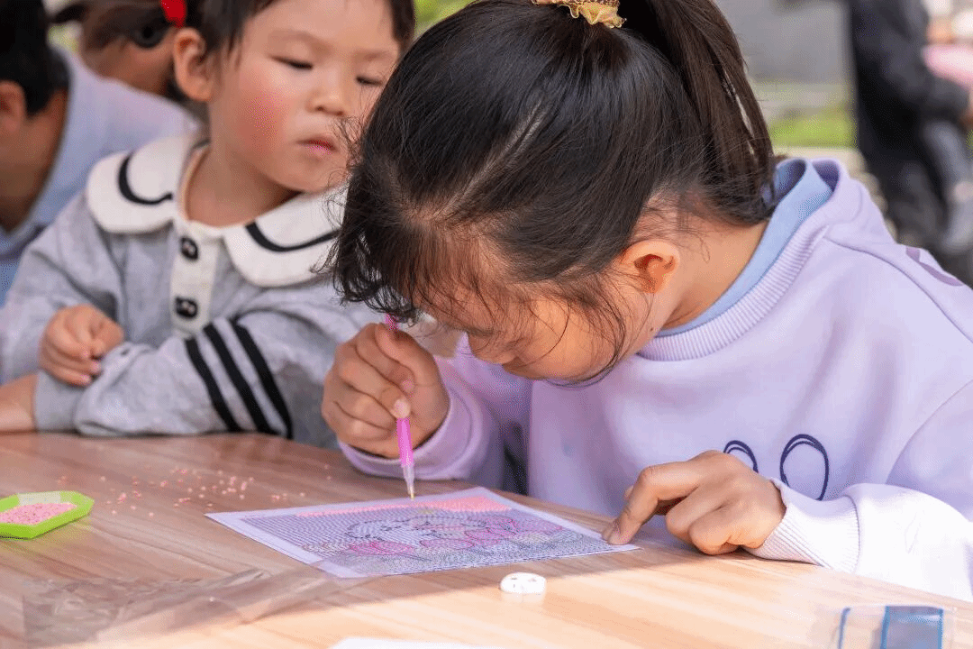 钻石画:在老师耐心指导下,孩子们将闪亮钻饰一一粘贴到位,亲子合作完成创意作品,手眼协调能力悄然提升。