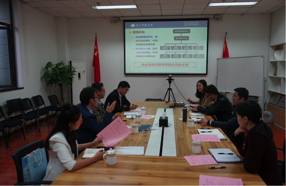 本网讯(电气与信息工程学院 程星晶/文)为进一步推进合作办学,提高人才培养质量,深化国际化教学改革,10月17日至18日,贵州理工学院院长助理、电气与信息工程学院院长李滚,副院长张均等一行4人赴电子科技大学格拉斯哥学院开展中外合作办学调研,格拉斯哥学院党总支书记高世全、党总支副书记何琪蕾等在主楼A1-307会议室热情接待我校一行。