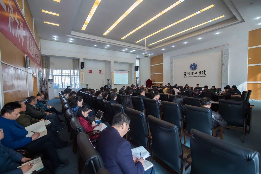 本网讯(校办 郝飞)2018年11月28日下午,学校在喀斯特会议厅召开第五次院长工作例会。院长龙奋杰主持会议,副院长宋建波、苏向东、胡兴灿,各学院(教学部)行政班子成员,各教辅单位、各产业研究院(中心)及各行政部门负责人,各专业负责人参会,党群部门主要负责人列席会议。
