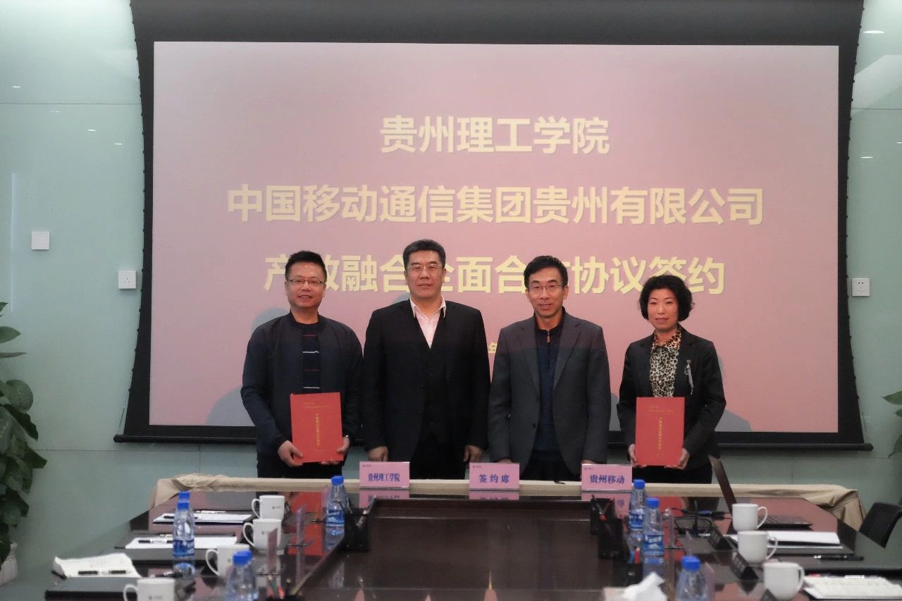 本网讯(宣传部 姚楠/文 中国移动通信贵州分公司 李旭/图文)12月5日,贵州理工学院与中国移动通信集团贵州有限公司举行产教融合全面合作协议签署仪式。贵州理工学院院长、校党委副书记龙奋杰,中移动贵州有限公司党委书记、总经理刘雪峰出席签约仪式。在双方相关部门负责人的共同见证下,贵州理工学院副院长胡兴灿与中移动贵州有限公司副总经理张丽代表双方签约。
