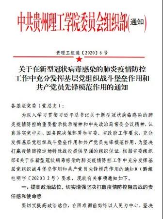 1月28日,学校印发《关于在新型冠状病毒感染的肺炎疫情防控工作中充分发挥基层党组织战斗堡垒作用和共产党员先锋模范作用的通知》,要求基层党组织和党员领导干部提高政治站位、强化责任担当、发挥职能作用,让党旗在防控疫情斗争第一线高高飘扬,为坚决打赢疫情防控这场特殊战役提供坚强的组织保证。