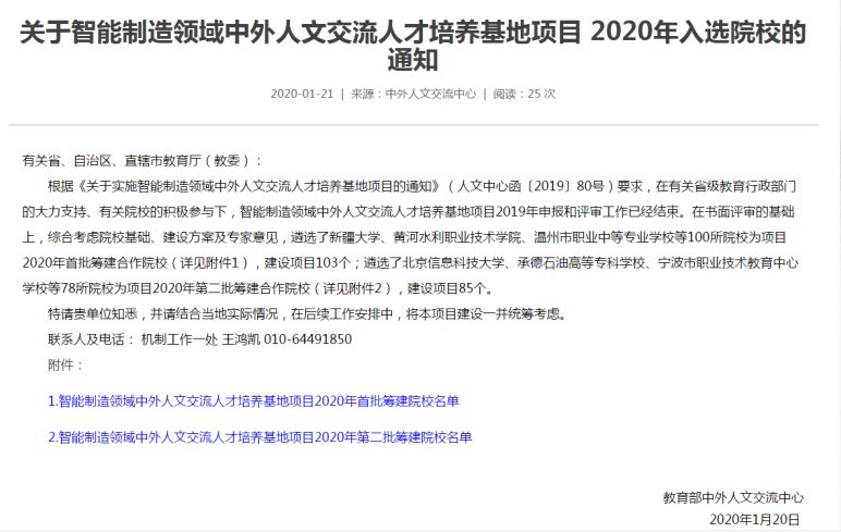 本网讯(国际交流与合作处 陈洲)2019年,教育部中外人文交流中心印发《关于实施智能制造领域中外人文交流人才培养基地项目的通知》(人文中心函〔2019〕80号),在全国范围内遴选高等院校实施智能制造领域中外人文交流人才培养基地项目,建设首批亚龙智能国际学院(亚龙智能国际技术创新中心),国际交流与合作处积极推进申报事宜,经沟通协调,依托航空航天工程学院、机械工程学院的优势特色学科专业进行了申报。2020年1月20日,教育部中外人文交流中心发布公告,我校入选智能制造领域中外人文交流人才培养基地项目2020年首批筹建院校。