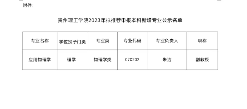 根据教育部《普通高等学校本科专业设置管理规定》、《教育部高等教育司关于开展2023年度普通高等学校本科专业设置工作的通知》(教高司函〔2023〕5号)相关要求,经二级学院申报、教务处组织论证、学校学术委员会审议,拟推荐应用物理学专业为我校2023年新增备案专业。