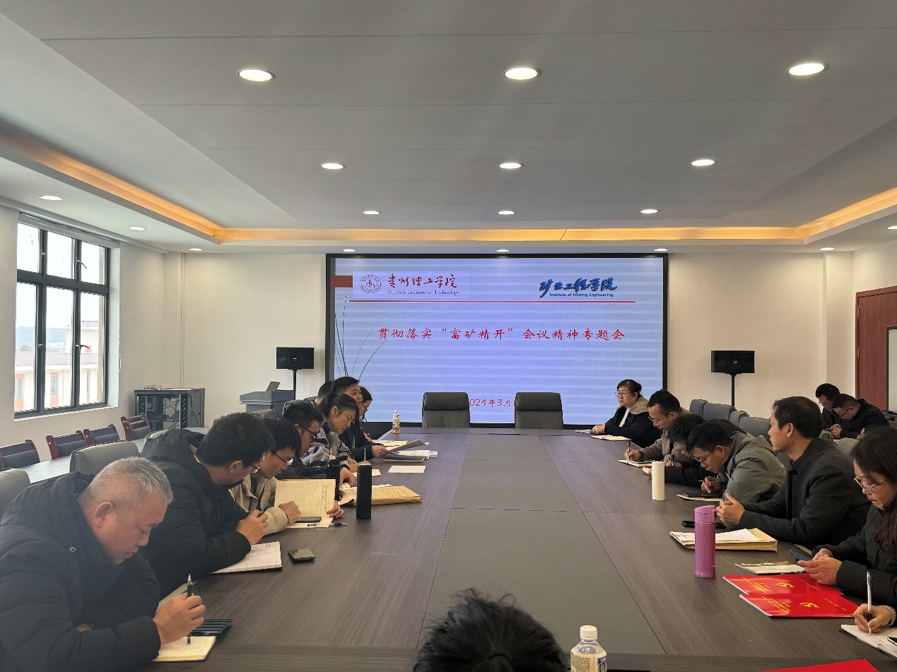 本网讯 (矿业工程学院)2024年3月8日,贵州理工学院矿业工程学院召开贯彻落实“富矿精开”会议精神专题会,党总支书记詹凤合主持会议,院长徐佑林传达学习上级有关精神并作主题发言,学院全体教职工参加。