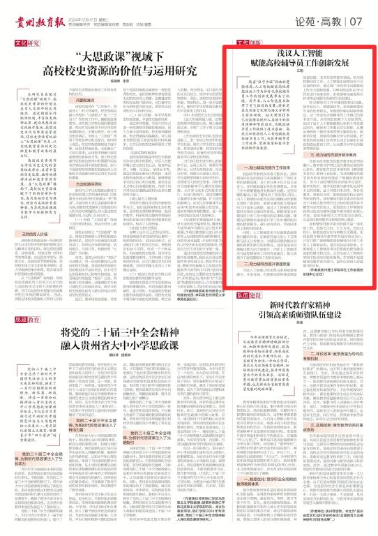 随着“数字中国”战略的蓬勃推进,人工智能赋能高校思想政治工作为新时代高校辅导员工作的创新发展带来了机遇。近年来,人工智能技术取得了突飞猛进的发展,特别是在自然语言处理与语义分析两大前沿领域。AI大模型技术已经能够实现对人类语言的深度理解和智能回应,为赋能辅导员工作提供了技术基础。高校应加快推进人工智能赋能高校辅导员工作,为提升辅导员工作效率、管理质量和数字素养提供价值意蕴。