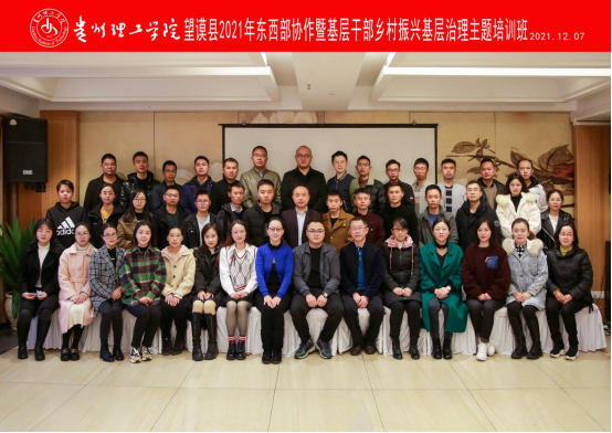 本网讯(继续教育学院 陈筠 王志芳)2021年12月6日—12日,由贵州理工学院承办的望谟县2021年东西部协作暨基层干部乡村振兴基层治理主题培训班在花溪万宜丽景酒店顺利开班。望谟县委非公有制经济组织和社会工作委员会书记陆相宇、贵州理工学院继续教育学院党总支书记刘路宁、贵州理工学院继续教育学院院长陈筠出席开班仪式,来自望谟县各单位43位学员参加了本次培训班学习。