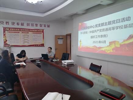 本网讯(评估中心 夏黄晶/文 刘平/图)根据学校安排,2021年6月8日上午,机关评估中心党支部开展学习贯彻《中国共产党普通高等学校基层组织工作条例》(以下简称《条例》)主题党日活动。