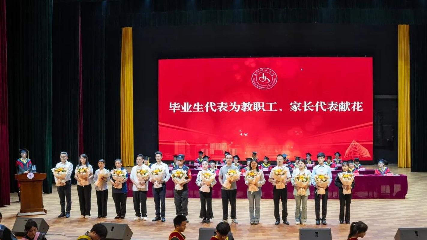 毕业生代表为家长代表、教师代表、毕业班辅导员班主任以及校团委工作人员、后勤管理处工作人员、图书馆工作人员、物业管理人员、保卫人员、食堂工作人员代表献花。