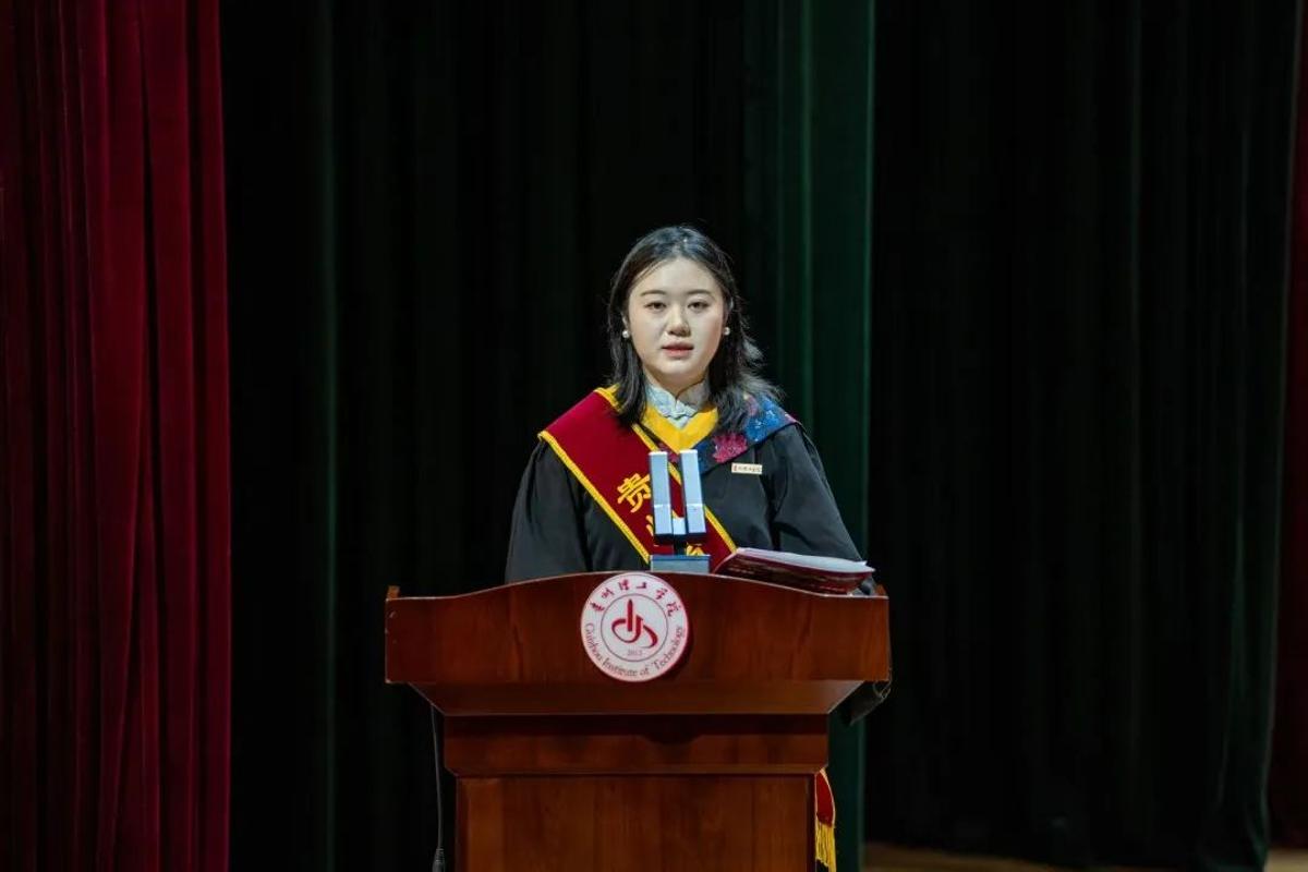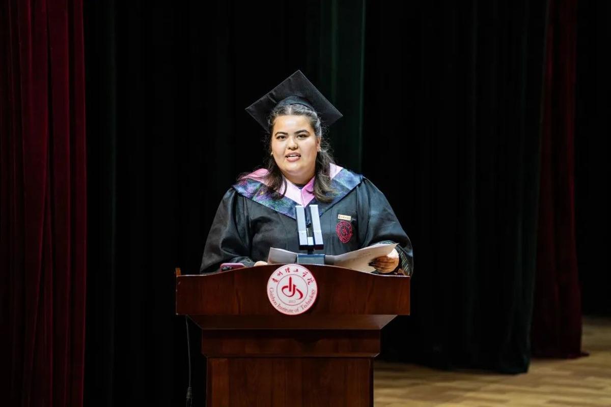 外国语学院英语专业211班的马亚同学作为留学生毕业生代表发言。马亚回顾了在多彩贵州这片神奇土地上的美好逐梦之旅,深情感谢母校的包容与关怀。表示作为外语学习者,既要脚踏实地钻研专业,更要心怀世界,勇于担当文化交流使者的责任。