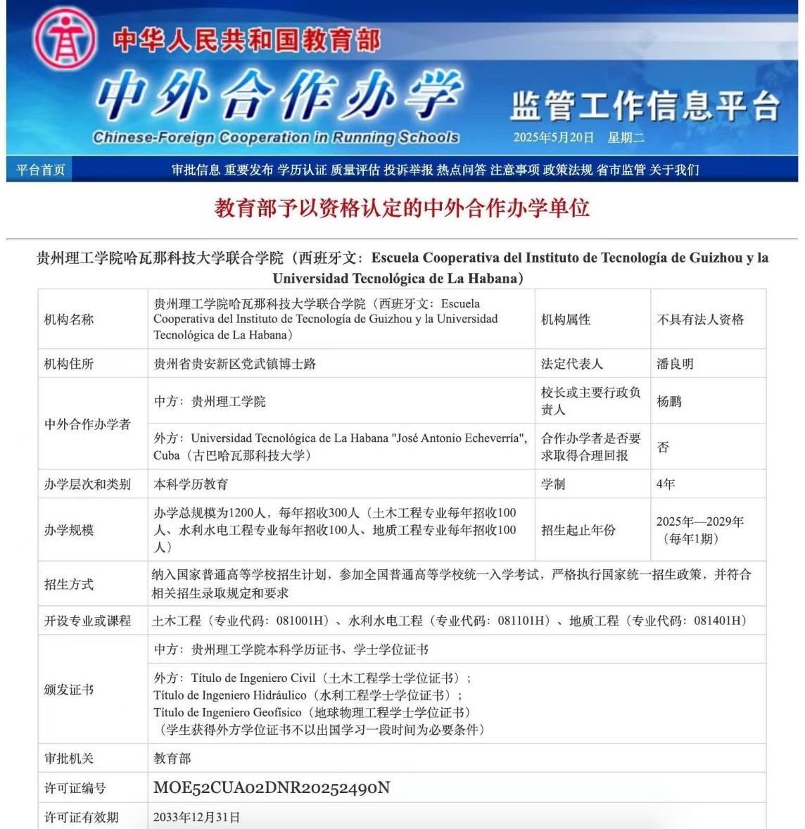 近日,教育部中外合作办学监管工作信息平台传来重磅喜讯:贵州理工学院与古巴哈瓦那科技大学合作设立的贵州理工学院哈瓦那科技大学联合学院正式通过教育部资格认定,成为学校首个获教育部批准成立的中外合作办学机构,是中拉首批工程类合作办学机构,也是全国为数不多用西班牙语授课的工程类中外合作办学机构,为中拉文明互鉴与科技教育融合开辟了全新路径。