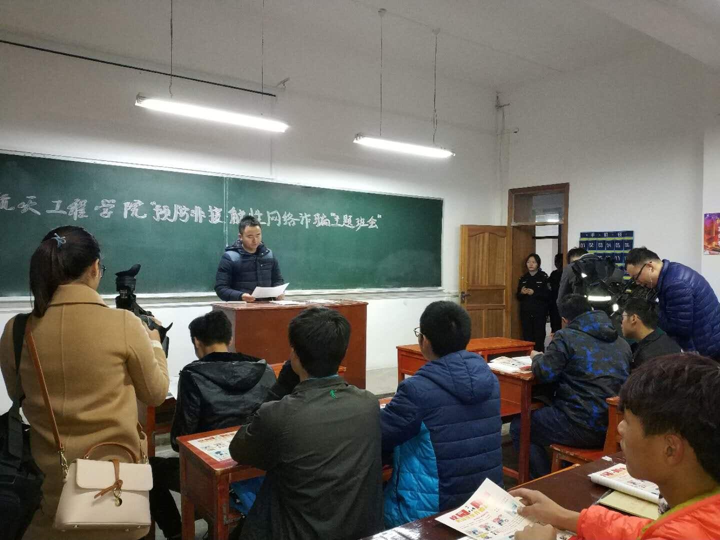 为进一步规范网络正常秩序,教育引导学生认清网络谣言危害,自觉抵制谣言传播,严厉打击网络谣言,维护校园和谐稳定发展大局,规范学生上网行为,切实加强网络管理,进一步引导学生文明使用网络,2017年11月23日19:30,航空航天工程学院学生科组织开展“预防非接触性网络诈骗”主题教育在一教101教室举行,主题教育由学生科副科长刘松老师主持,蔡家关派出所、学校保卫处相关负责人及航空航天工程学院2017级新生参加此次活动。