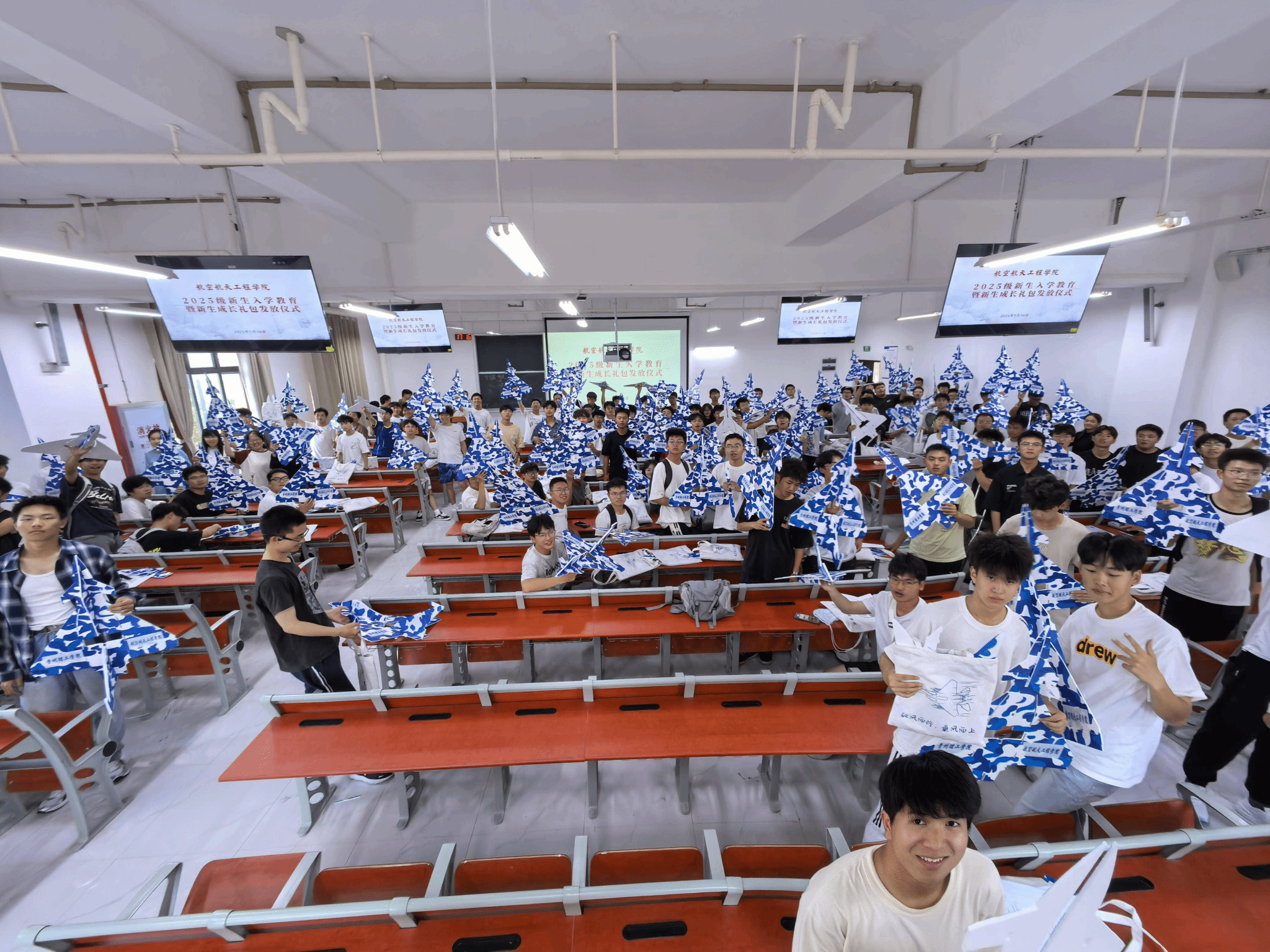 专业讲解结束后,学院的各位老师和领导一同为新生发放了专属成长礼品——飞机航模。这份饱含着航空航天梦想的礼物,既契合了学院的专业特色,也寄托了对新生“以模型为起点,探索空天奥秘”的期望。现场,新生们接过航模,脸上洋溢着期待与喜悦。