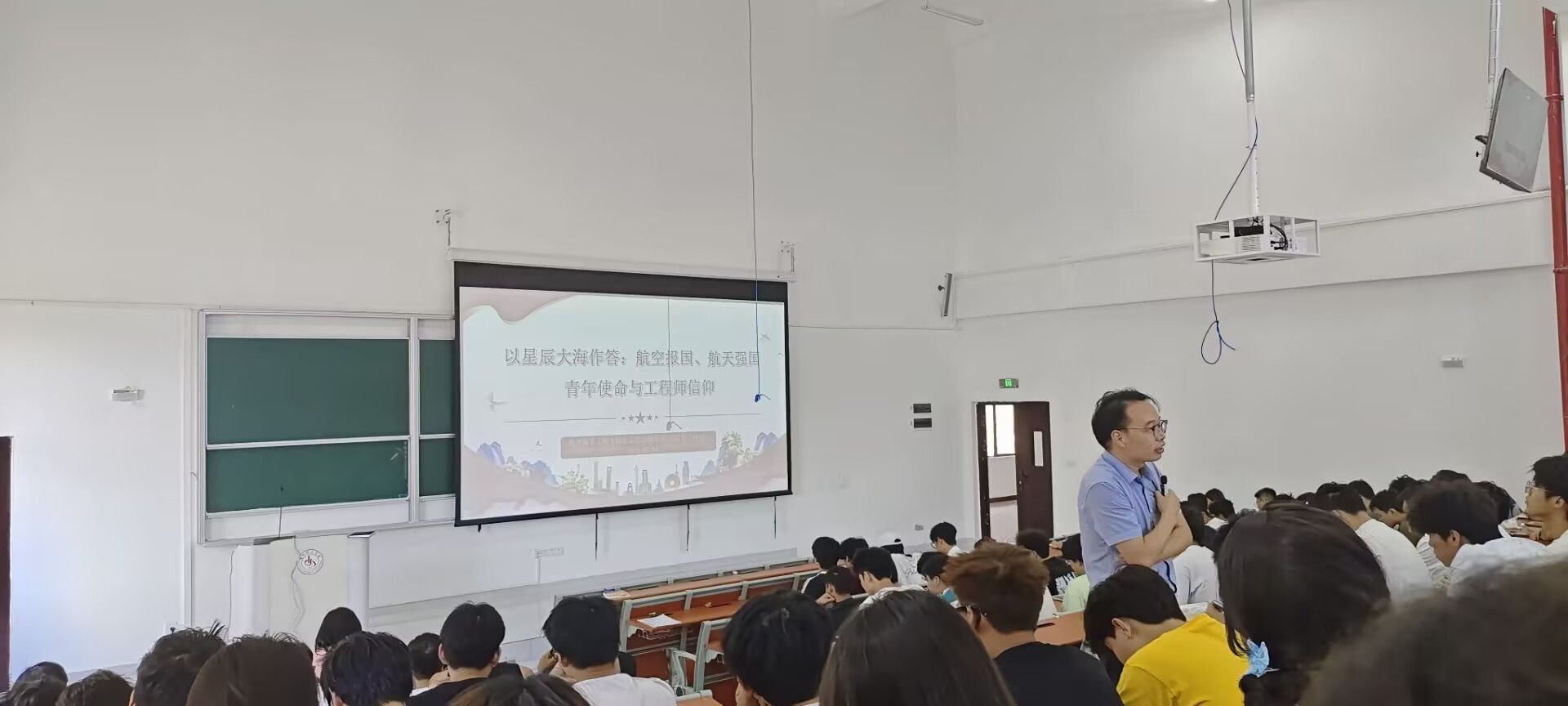 杨院长从“航空报国,航天强国”、“工程师与工程师信仰”和“新时代青年使命”三个方面为大家展开讲授,以歼20战机图片开头,《沃尔夫条款》为线索,众多的案例为元素,带领大家领悟不管是科学家、工程师还是技术工人、螺丝钉,每个青年的时代使命和责任担当。他强调,大学是知识积累与能力塑造的关键期,航空航天领域对专业知识深度广度要求极高,大一的基础课程更是构建知识体系的基石。他告诫同学们,要珍惜时光,端正态度、刻苦钻研,把每一门课学精学透,为未来投身航空航天或其他领域筑牢根基,以青春之我践行报国使命,让工程师信仰在扎实学习中落地生长,在逐梦星辰大海的征程中绽放光彩。