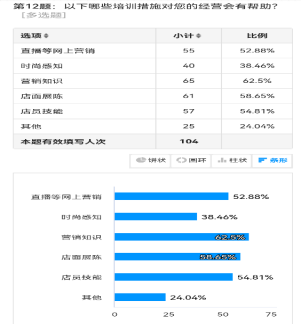 第一份问卷共收回104份有效问卷,从他们所填写的内容中我们得出结论:社区居民中青年人数较多,他们中大多数人都认为自己的经营状况较好,充分考虑了客户的需求,希望能在降低经营成本、防疫安全、引流促销等方面得到支持;认为在营销知识、店面展陈、店员技能、直播等网上营销方面进行培训会对经营有所帮助,大多数人在市场的疫情管理方面都满意。
