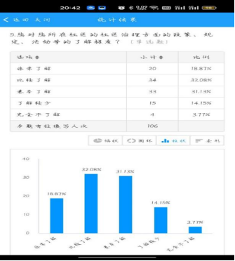 第二份问卷共有106份有效问卷,统计表明:大多数居民对社区的治理方面的政策、规定、活动等都基本了解或比较了解;社区的治理在公共设施、物业服务、邻里关系等方面存在一些问题,需要改进,基层建设是非常重要,社区是服务群众的“最后一公里”;在疫情状态下,超过一半居民们无不满意之处,动态对于疫情都很关注和重视,支持社区在疫情期间的防控措施,商铺经验状态都较好,对自己的商铺经营有更好的期待。