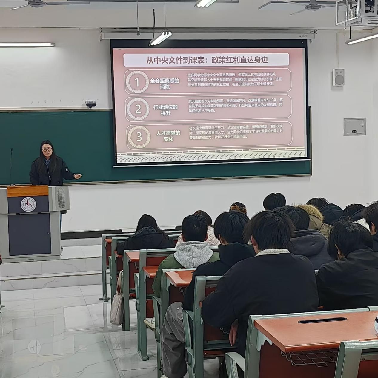 本网讯 图、文/谭又铭)2025年12月10日,航空航天工程学院辅导员于茂竹在B01-113教室,为2023级、2025级同学带来“逐梦蓝天:党的二十届四中全会精神与航空青年使命”主题宣讲,让全会精神精准对接青年学子成长发展。