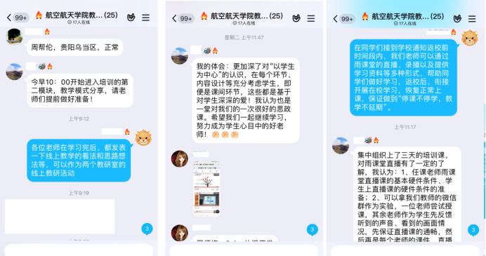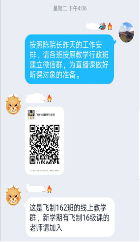 培训课程结束后,航院全体教师开展了线上教学研讨,通过多种网络教学模式,确保航院全体师生“停课不停学,教学不延期”。大家在QQ工作群中展开了热烈的讨论,分享自己的学习心得和线上教学措施想法。教师们纷纷表示要充分利用好雨课堂、维普毕业设计系统等线上资源学习平台实施线上教学,通过QQ群、微信群等形式积极开展网上教研备课、互动答疑和作业评价反馈等活动,帮助学生在家做好学习。学院还将继续组织集中培训,积极开展线上教研活动,保证开学时正常教学。在疫情防控期间,航院全体师生将共同努力,众志成城,共克时“疫”。