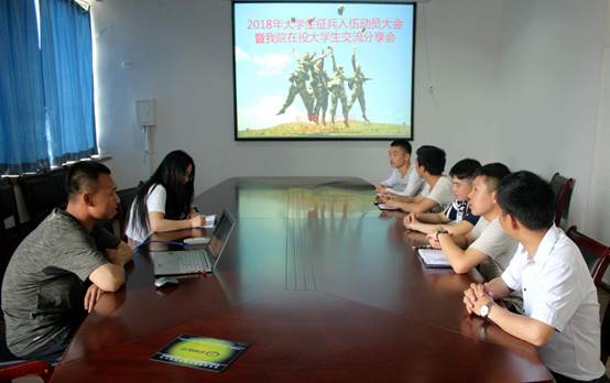 为贯彻落实国家的征兵政策,提高兵源质量,进一步鼓励和引导优秀大学生应征入伍。5月17日中午,我院在1318会议室召开2018年大学生征兵入伍动员大会暨我院在役大学生交流分享会。我院优秀在役大学生士兵李渊博在会上与同学们进行交流分享。学生科科长刘松、学院有参军入伍意向的学生参与了本次大会,大会由我院辅导员于茂竹老师主持。