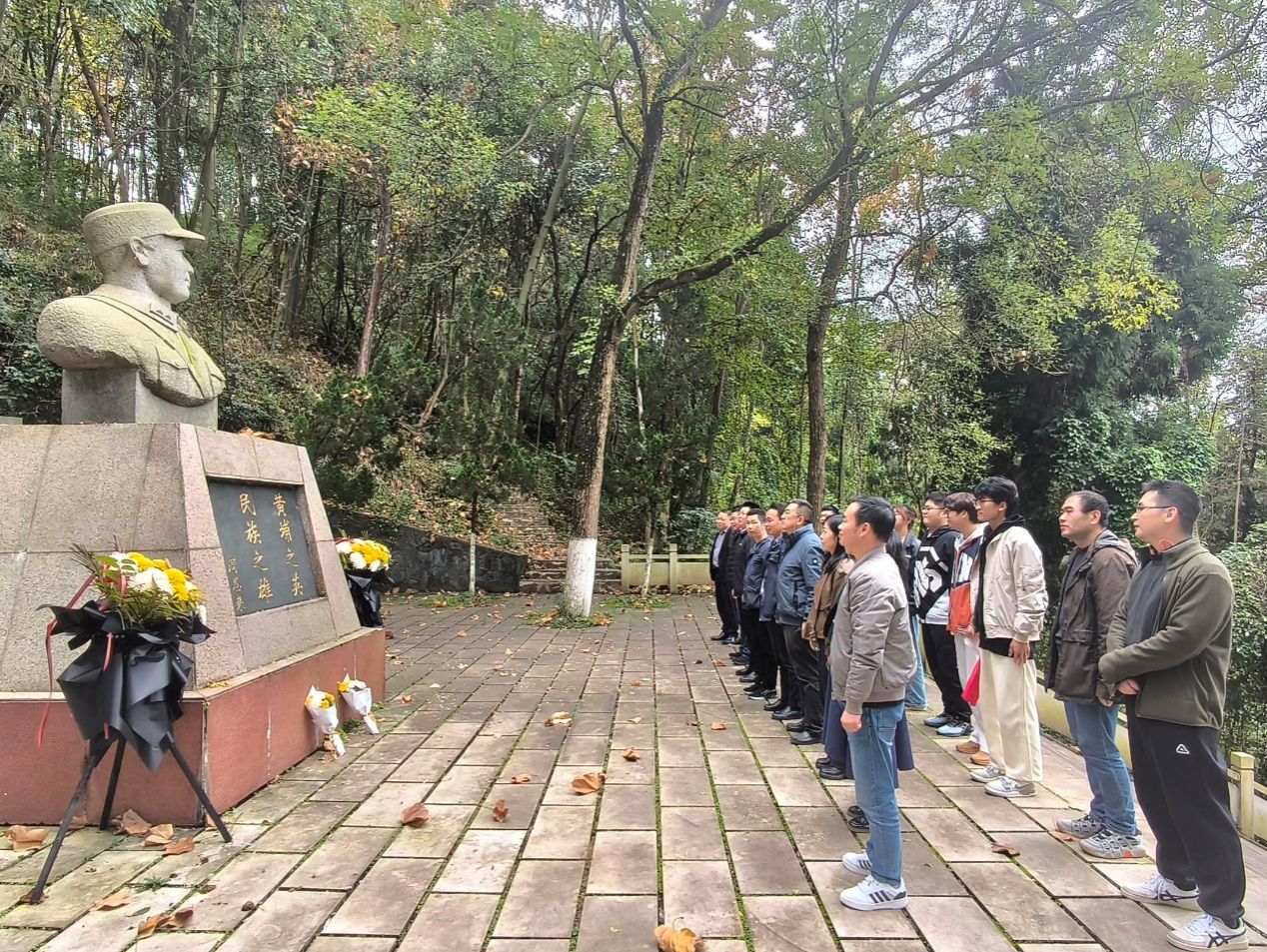随后,全体师生党员集体前往公园内的戴安澜将军衣冠冢。在庄严肃穆的雕像前,师生代表敬献鲜花,三鞠躬致敬。通过讲解介绍,大家深入了解了抗日名将戴安澜将军远征缅甸、壮烈殉国的英勇事迹。在防空亭遗址与“生聚教训”摩崖石刻前,师生们驻足凝视,结合历史背景展开讨论,深刻体会到革命先辈“以血肉筑长城”的坚韧与担当。