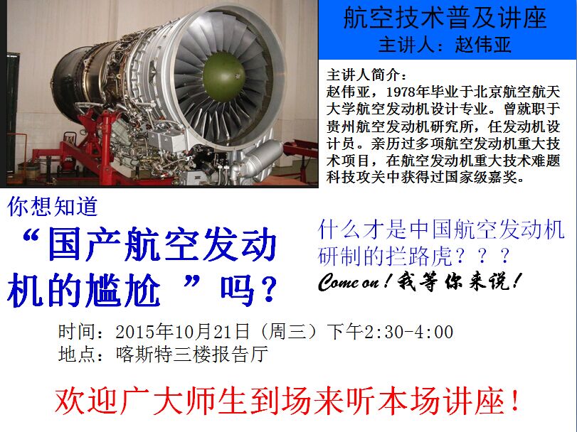 2015年10月21日下午14:30在喀斯特三楼报告厅,航空航天工程学院邀请原贵州航空发动机研究所航空发动机设计工程师赵伟亚来我院做关于“国产航空发动机的尴尬”的讲座。全院学生和部门学院学生积极参加聆听本场讲座。院党总支书记李青、院长陈海虹和其他专业任课教师也出席了本次讲座。