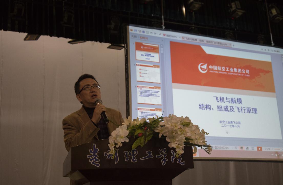 2017年10月20日下午16:30,贵州理工学院第四届“创新 创业 创意”大学生学术科技节之第三届航模科技竞赛启动仪式,暨航空航天工程学院“志者鲲鹏•翅展蓝天”系列讲座(一),在贵州理工学院逸夫大礼堂举行。贵州理工学院校长助理张清江副教授、中航工业贵飞贵航所总体气动部副部长胡勇军高工、航空航天工程学院党总支书记李青副教授和执行院长黄芳教授、航院全体师生,以及第三届航模科技竞赛参赛队员等近500人参加活动。