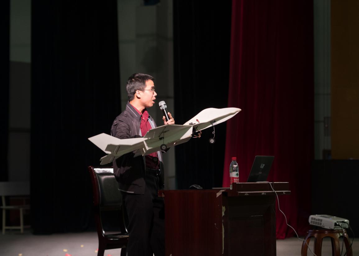 张清江副教授在发言环节,代表学校对本届航模科技竞赛暨“志者鲲鹏•翅展蓝天”系列讲座进行现场指导。张清江副教授指出,无人机发展与应用日新月异,航模科技竞赛对无人机发展起到很好的推动作用,举办航模竞赛对无人机发展及大学生创新创业能力培养的具有非常重要的作用。张清江副教授还代表学校,对参与这届竞赛的同学表示的欣慰,并要求同学们要注意考场纪律及航模制作和飞行现场纪律,绝对服从老师的安排和指导,充分发挥聪明才智及创新精神,各队员相互配合,全力以赴完成竞赛并获取优异的成绩;对举办这届航模科技竞赛的相关部门及老师表示诚挚的谢意;并对接下来为同学们作讲座的中航工业贵飞贵航所总体气动部副部长胡勇军高工及随行的石东波工程师表示衷心的感谢。