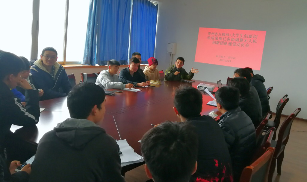 贵州省“互联网+”大学生创新创业成果展暨总结会即将于2018年1月6日在我校举行。为协调部署我院创新创业成果展示任务,动员学生提前开展建立无人机创新团队、申报2018年度创新创业训练项目等工作,我院于2017年12月29日在学院会议室组织召开了贵州省互联网+大学生创新创业成果展任务协调暨无人机创新团队建设动员会。我院党总支书记李青教授、创新创业负责教师杨登红博士和崔祚博士,贵州理工学院航模队和无人机创新创业实验室管理团队全体成员,以及省级以上创新创业训练项目的负责人等近30人参加了会议。