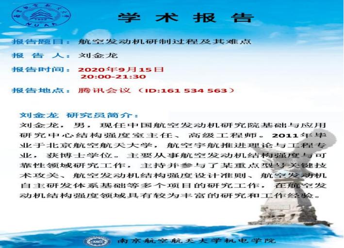 (本网讯 图文/陈玉飞)为激发大学生的创造力和想象力、增强大学生学习航空航天知识的学习热情、培养造就“大众创业、万众创新”的生力军、促进“互联网+”新业态形成、服务经济提质增效升级;以创新引领创业、创业带动就业、推动高校毕业生更高质量创业就业,航空航天工程学院于20209月15号组织《刘金龙学术报告》线上学习活动。本次活动面向航院全体学生,活动由教务科吴红红老师主持。