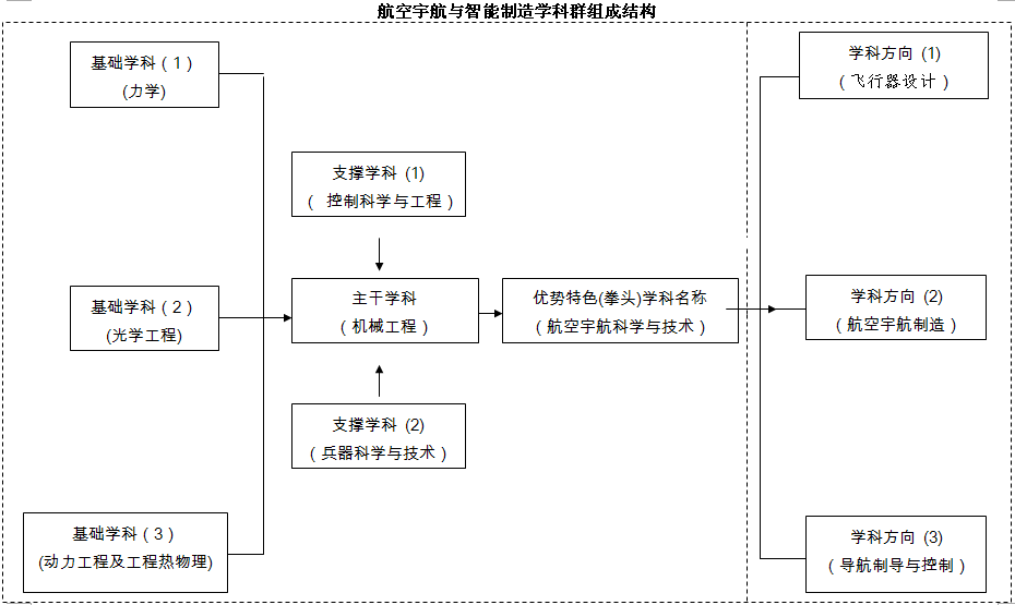 学科群设有飞行器设计、航空宇航制造、导航制导与控制三个学科方向,由七个一级学科共同支撑建设。其中,由航空航天工程学院牵头的省级特色重点培育学科“航空宇航科学与技术”作为拳头学科,在学科群中具有引领、布局和推动学科群发展的作用和地位;“机械工程”作为主干学科,可为拳头学科提供优化设计、制造新技术支撑;“控制科学与工程”和“兵器科学与技术”作为支撑学科,提供拳头学科和主干学科所需的控制技术并向航天技术领域拓展;“力学”、“光学工程”和“动力工程及工程热物理”作为基础学科,可为其它各学科提供基础理论、计算方法和研究工具,起到铺垫、升华与巩固作用。学科群由航空航天工程学院牵头,联合机械工程学院、电气与信息工程学院、理学院等多个二级学院,形成学科交叉、融合发展的特色平台,为贵州发展战略定位之一的“航空航天为重点的装备制造基地”提供多学科的创新资源、培养所需的学科交叉型人才、培育高水平的成果,建立 “学科交叉融合、教育资源优化组合”的创新体制机制。