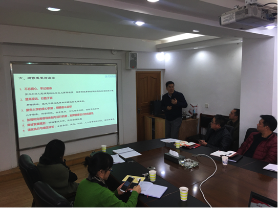 本网讯(学院办公室 郝飞,机关第六党支部 杨桂芳) 根据中央和省委《关于在推进“两学一做”学习教育常态化制度化中迅速掀起学习贯彻党的十九大精神和习近平总书记重要讲话精神高潮的通知》精神和工作要求,12月5日上午,校党委副书记、校长龙奋杰为相关单位教职工党员宣讲党的十九大精神。校党委副书记张波,学院办公室处科级干部,食品药品制造工程学院、经济管理学院、大数据学院党政负责人及机关党委第六教工党支部全体党员参加学习。