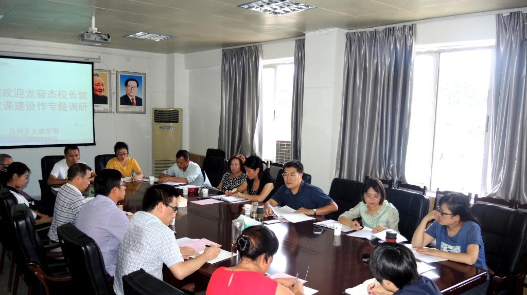 下午,龙奋杰到马克思主义学院走访调研。听取了马克思主义学院相关工作汇报。龙奋杰指出,思政教育是系统工程,对人才培养质量具有基础性、引领性的作用,全校教职工都要提高对思政教育的重视。马克思主义学院要继续加强领导班子建设,做到学生培养好,教师发展好,将课程建设作为马克思主义学院工作的重中之重,保证标准、创立特色,要制定一套行之有效的激励机制,密切与教务处、学工部等相关部门的工作对接,形成联动工作机制,共享易班平台提高思政教育水平。