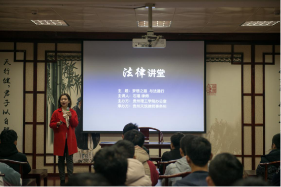 为深入贯彻落实十九大精神和省委、省政府关于“七五”普法的有关文件精神,深入推进“依法治国”的治国方略,2018年12月4日晚,由贵州理工学院办公室主办,贵州天筑律师事务所承办的“梦想之路 与法同行”为题的法制宣传专题讲座,在贵州理工学院在图书馆四楼道德讲堂举办了以,本次讲座邀请了贵州天筑律师事务所石瑾律师担任主讲人,机械工程学院部分学生参加聆听。