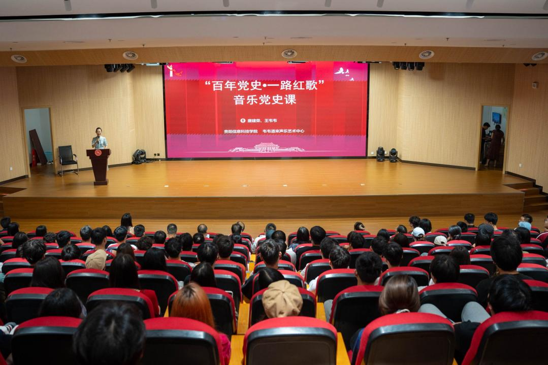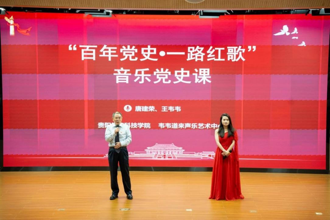 本网讯(大数据学院 文/图 陈晖)2025年6月26日,应大数据学院党总支邀请,教育部直属高校特聘党建联络员、贵州省省管专家、贵阳信息科技学院校长唐建荣教授和青年花腔女高音、国家二级演员王韦韦通过“主讲+主唱”形式,在我校蕴华楼四楼多功能厅联手为师生带来一堂别开生面的“百年党史·一路红歌”音乐党史课。大数据学院师生党员及学生代表、贵阳信息科技学院教师党员共二百余人参加。